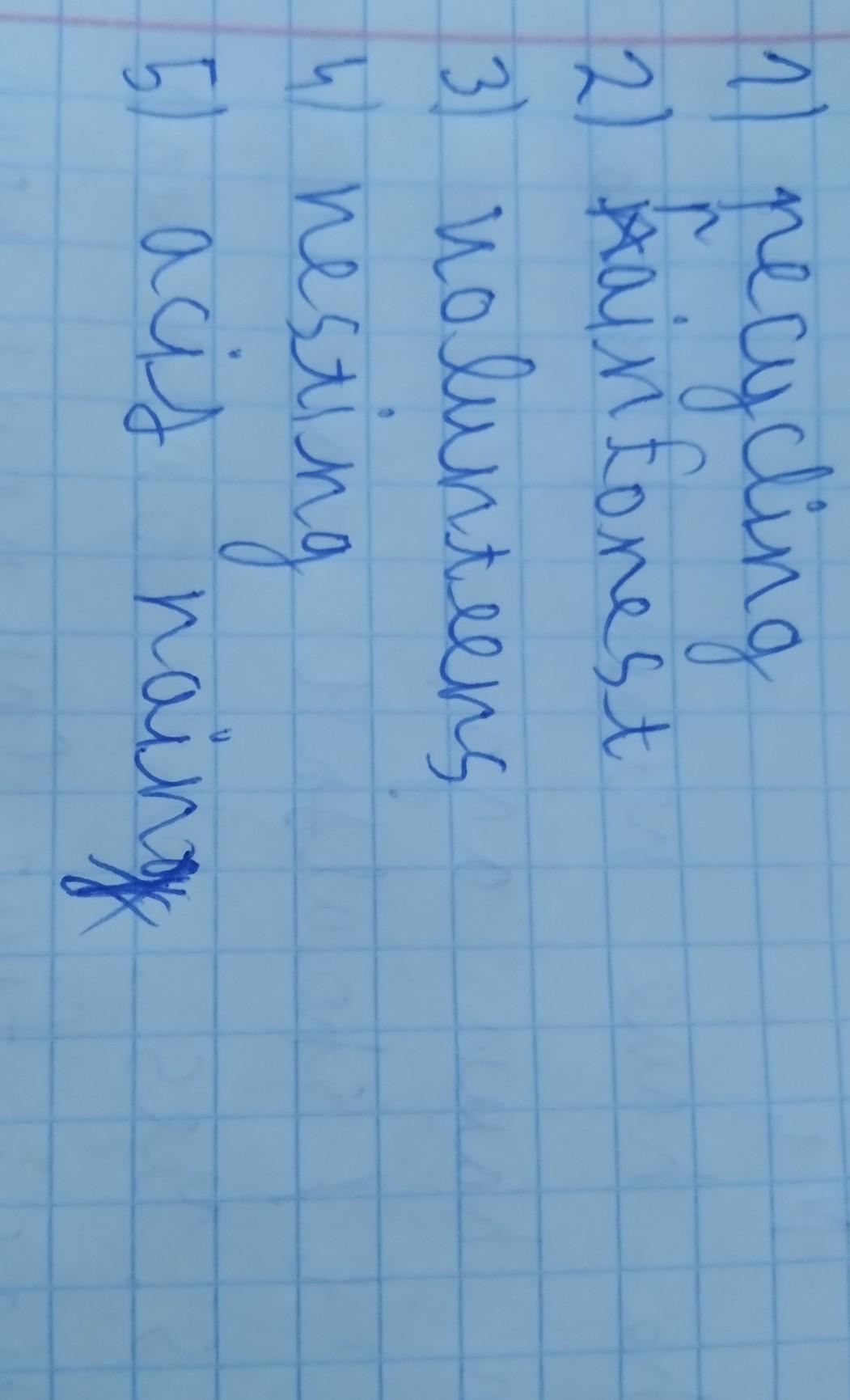1 recycling 2 rainforest 3 volunteers 4 nesting 5 acid rain