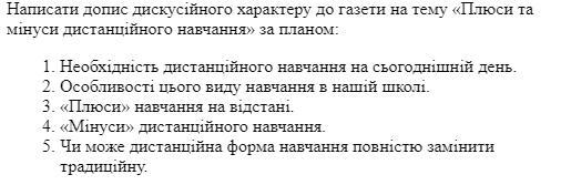 Одною з переваг такого виду навчання на мою думку - це велика кількість вільного часу , ми можемо більше зайнятися своєю улюбленою справою , або підтягнути проблемні предмети у школі. Ще великий плюс дистанційного навчання є те , що ми можемо навчатися в зручний для себе час . А ось одним з недоліків дистанційного навчання те , що ми не знаходимося в суспільстві і не вистачає живого спілкування. У дистанційному навчанні дуже поганим є те , що треба опрацьовувати матеріал наодинці і деякі теми можуть бути незрозумілими.