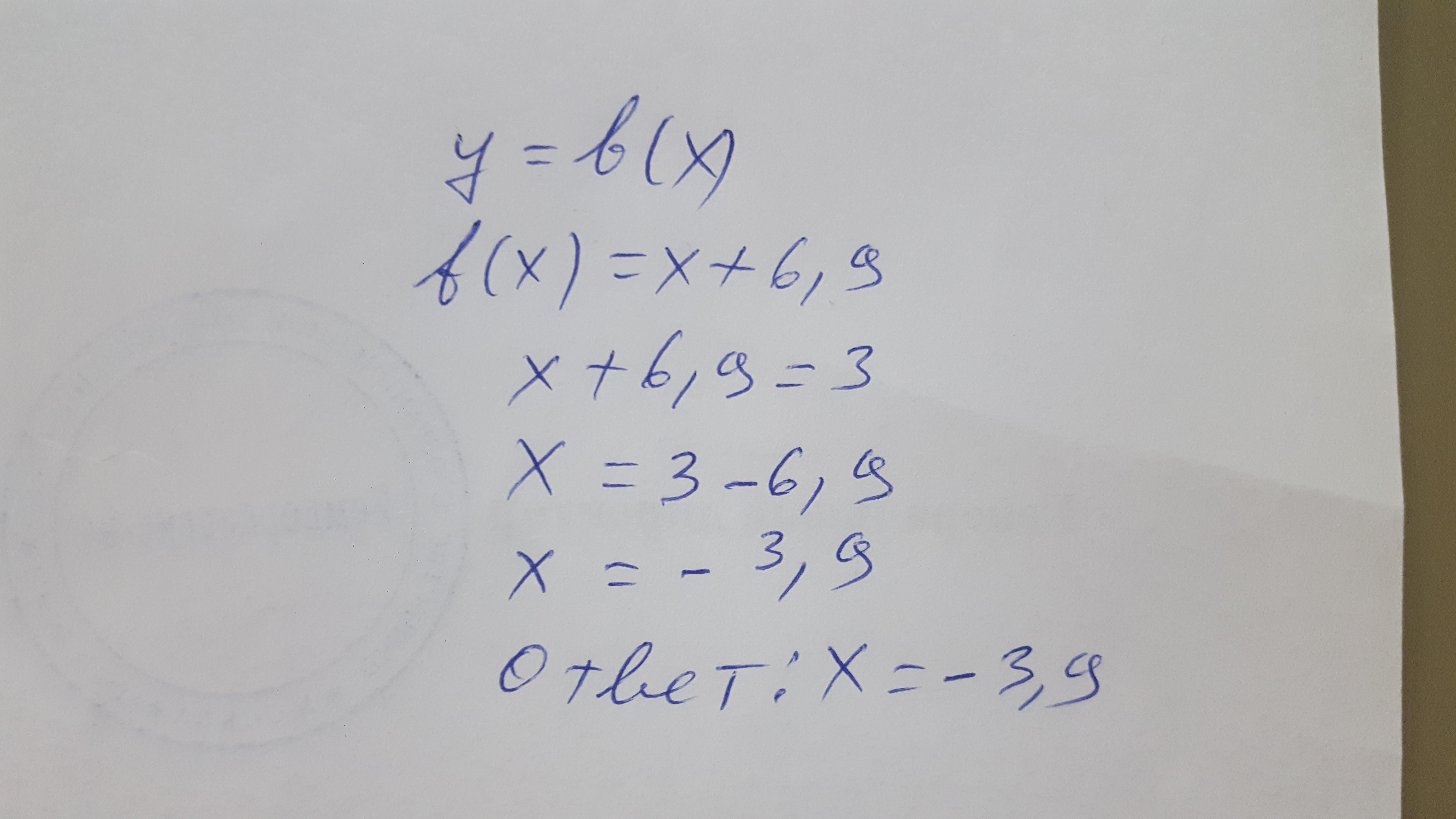 Дана функция y=f(x), где f(x)=x+6,9. При каких значениях аргумента выполняется равенство f(x)=3? Ответ x=...