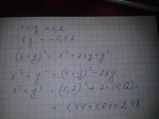 x^2+y^2=(x+y)^2-2xy=(1.2)^2-2(-0.52)=1.44+1.04=2.48