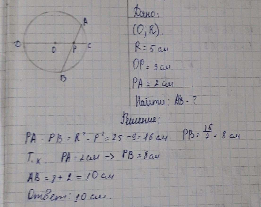на расстояний 3 см от центра окружности радиуса 5 м отмечена точка Р Хорда АВ проходит через точку Р. Найдите длину хорды АВ, если РА=2 см