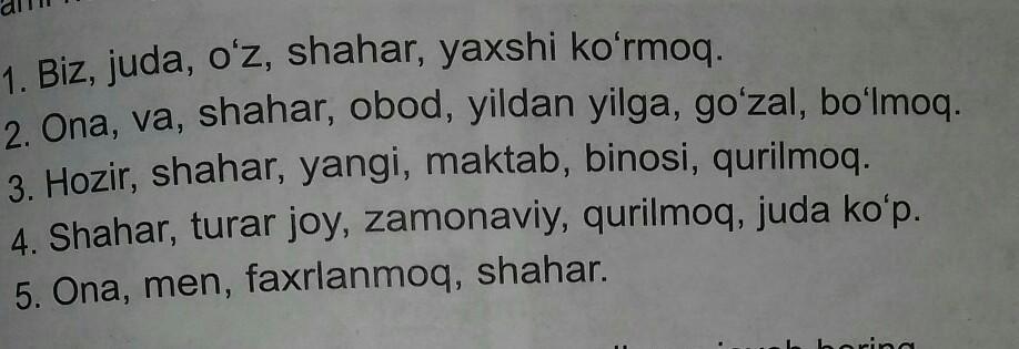 3-mashq.Berilgan so'zlarni o'zaro bog'lab gaplar tuzing. Fe'llarni hozirgi zamonda qo'llang.