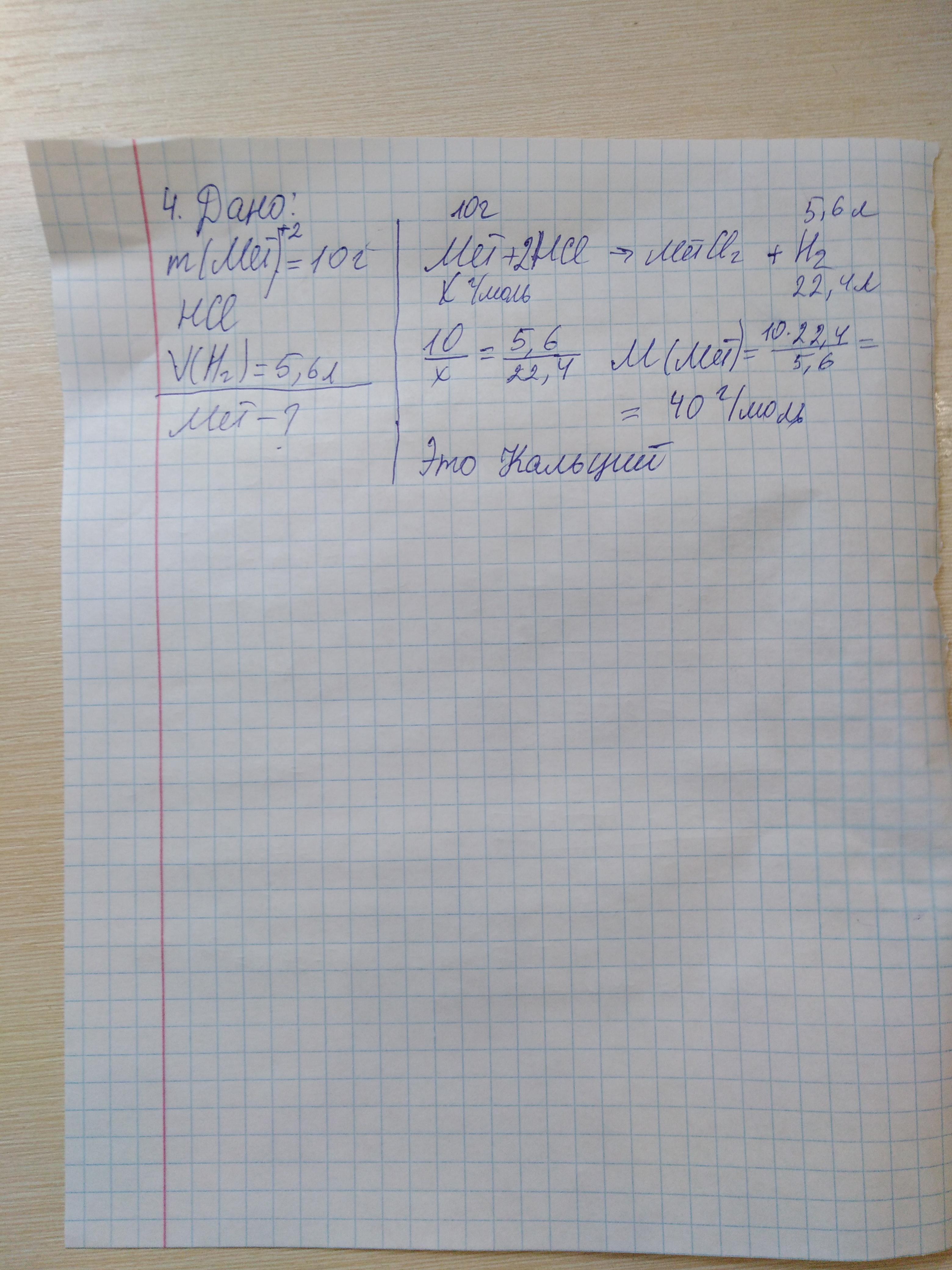 4) Образец металла массой 10г прореагировал с избытком соляной кислоты. При этом выделился водород объёмом 5,6л. Укажите металл, зная, что степень окисления равна +2.