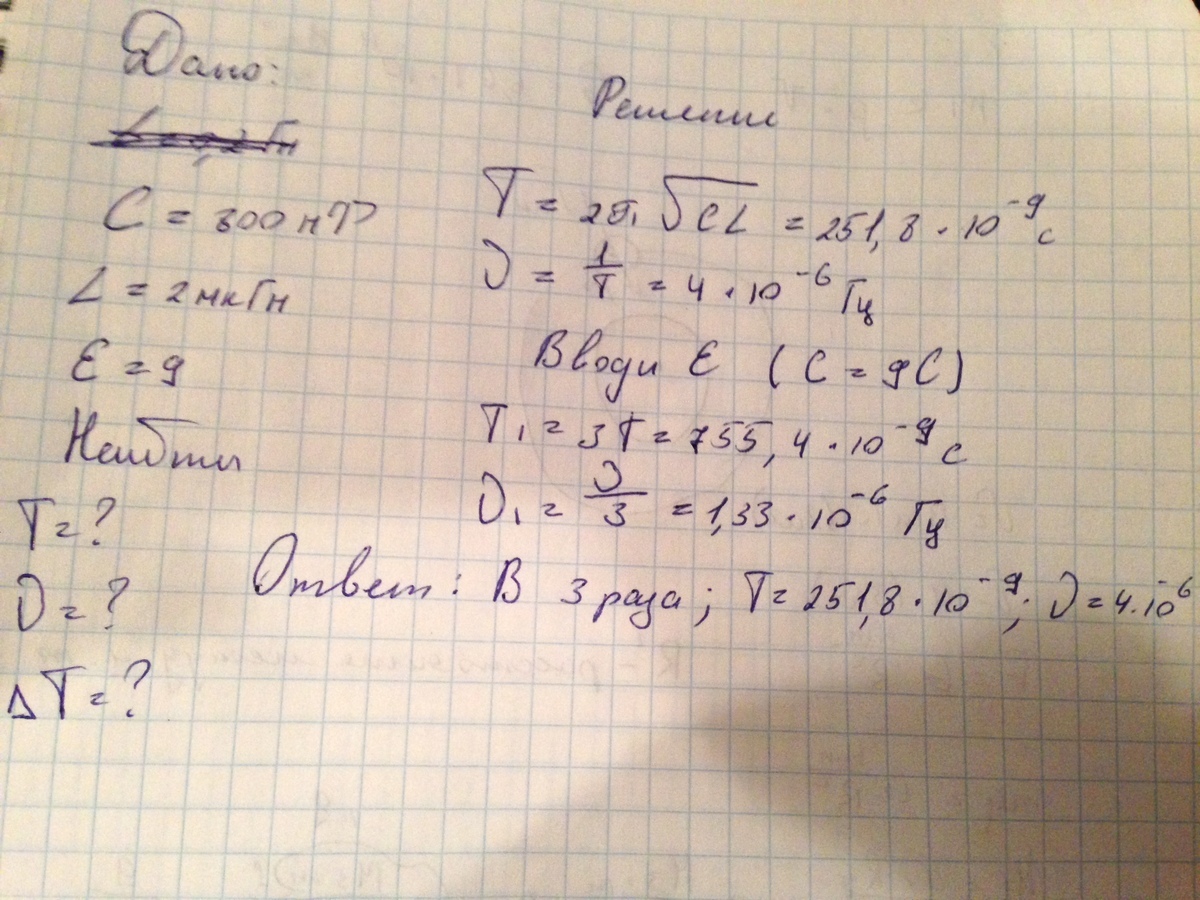 Найти период и частоту колебаний в контуре,состоящем из конденсатора емкостью 800 пФ и катушки индуктивностью 2мкГн.Во сколько раз изменится период колебаний,если конденсатор ввести в диэлектрик с диэлектрической проницаемостью 9