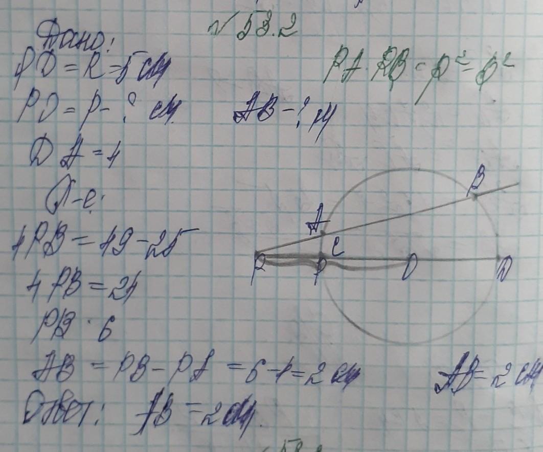 На расстоянии 7 м от центра окружности радиуса 5 м отмечена точка Р. Прямая, проходящая через точку Р, пересекает окружность в точках А и В. Найдите длину хорды АВ, если РА=4 м