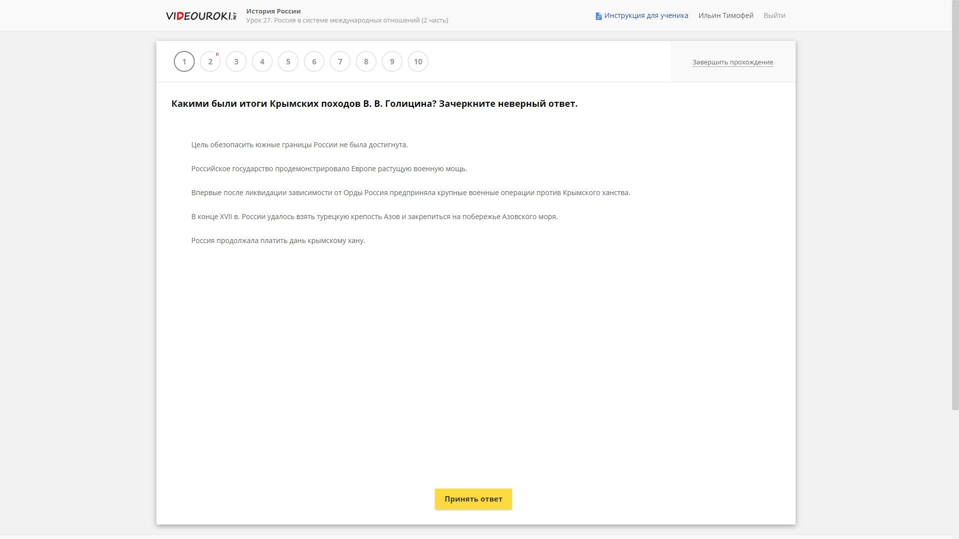 второй неверный, походы были неудачными, первый раз Голицын даже не дошел до поля действий из-за погоды (были какие-то сильные туманы на Дону)