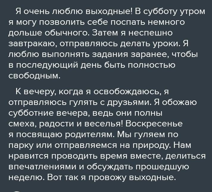 Мен демалысты жаксы көремін! Мен сенбі күні көп ұйықтаймын. Сосын асықпай асымды ішемін де сабағымды орындаймын.Мен үй тапсырмасын ерте орындағанды жақсы көремін сосын келесі күні бос болып жүремін.