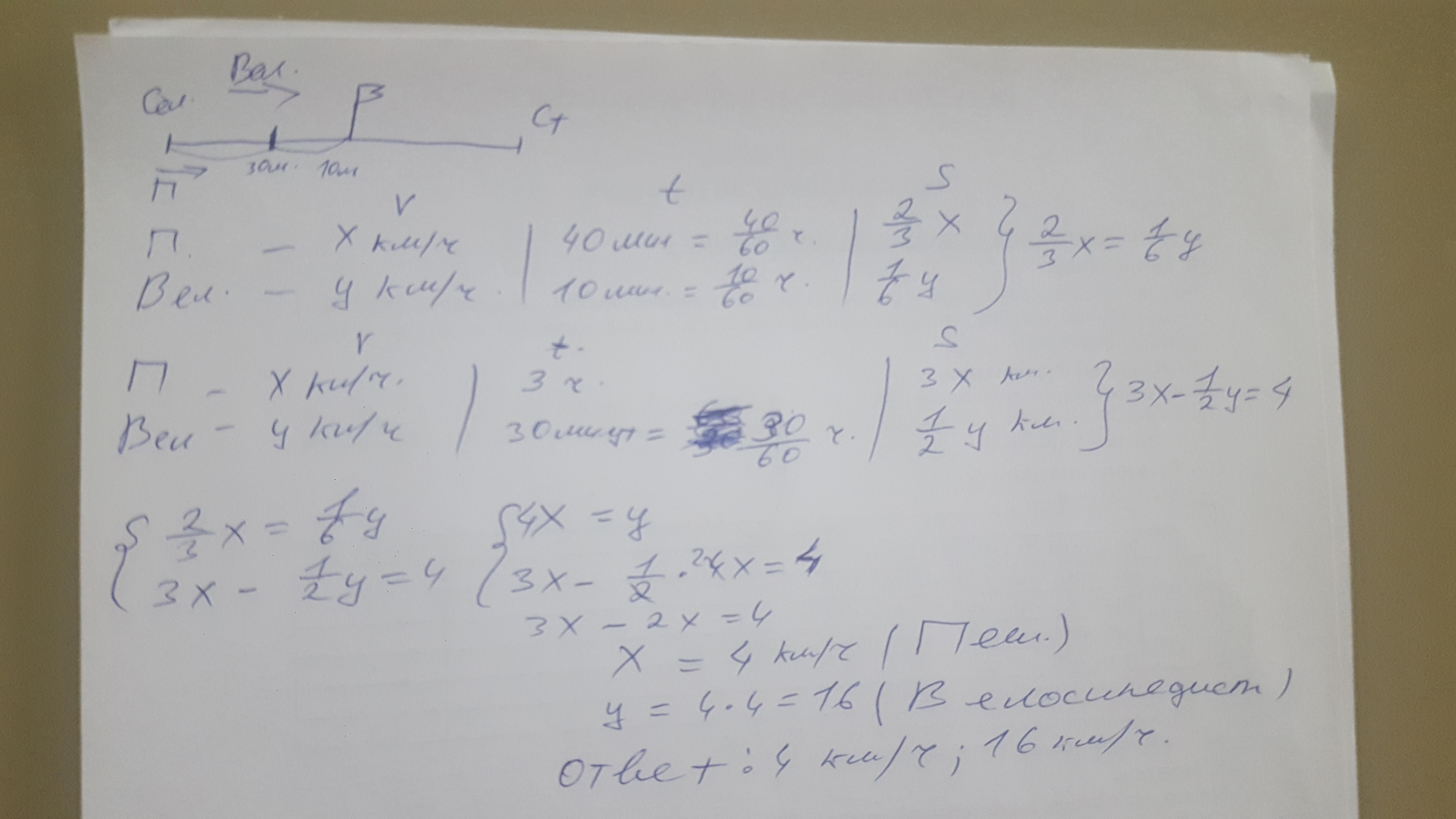 2) Из села на станцию вышел пешеход. Через 30 минут вслед за ним выехал велосипедист и догнал пешехода через 10 минут после своего выезда. Найдите скорости пешехода и велосипедиста, если пешеход за 3 часа проходит на 4 км больше, чем велосипедист проезжает за полчаса.