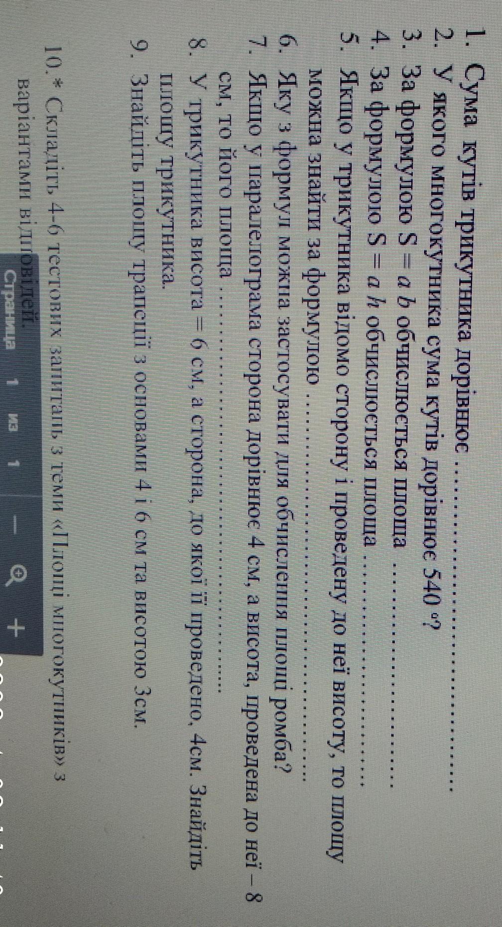 5. Ответ: 0,5*h*а. (где а - длина стороны, а h - высота, проведённая к этой стороне.)