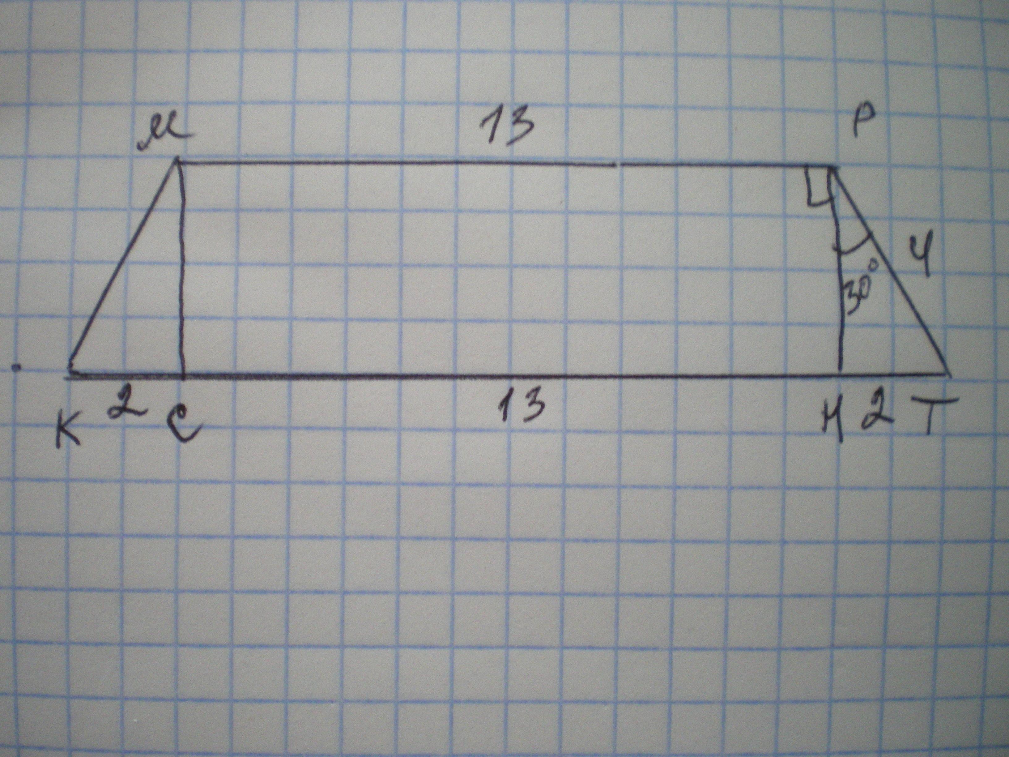 S=(МР+КТ):2*РН=(13+17):2*2√3=30√3 см²