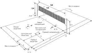 , нужно нарисовать волейбольную площадку. Указать названия линий и их размеры.