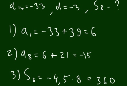 Вычеслите сумму 8 членов, если а14=--33,d=-3
