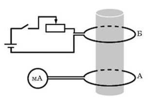 2. Определите направление индукционного тока в контуре А, помещённом в магнитное поле контура Б (см. рисунок), в случае:
