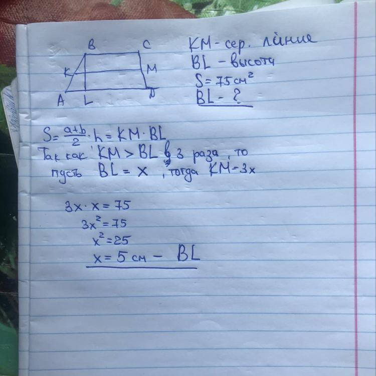 найдите высоту трапеции если она в 3 раза меньше средней линии трапеции а площадь трапеции равна 75 см²