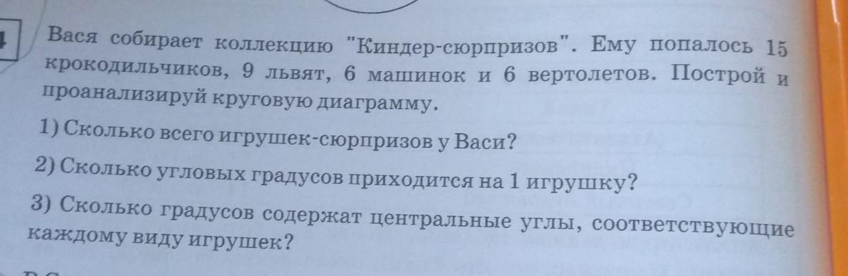 Строим круг. Проводим радиус и откладываем с помощью транспортира вычисленное число градусов для каждой игрушки по очереди. Отложенное для одной игрушки число градусов является началом отсчета для другой.. Если построение правильное, то свободного места в круге остаться не должно
