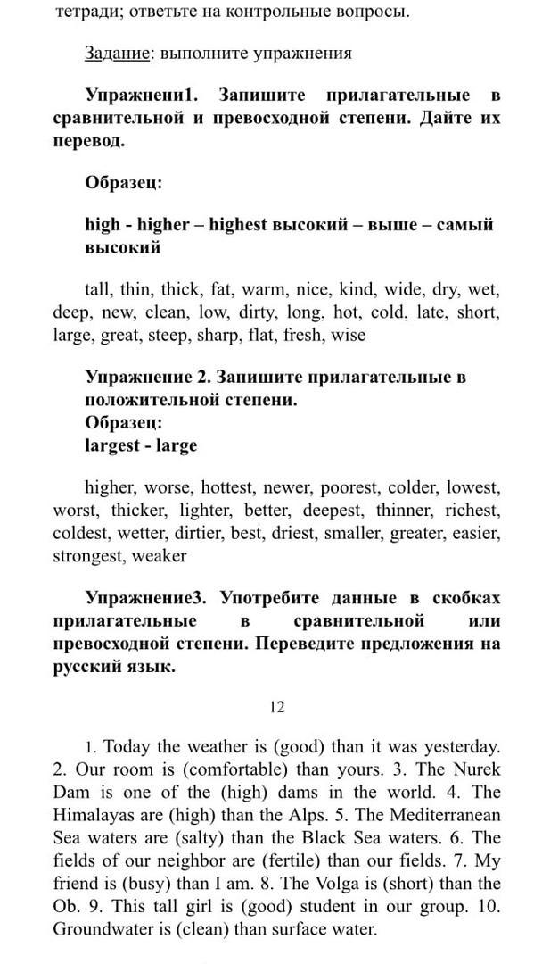 1. tall - taller - tallest - высокий - выше - высочайший, thin - thinner - thinnest - тонкий - тоньше - самый тонкий, тончайший, fat - fatter - fattest - толстый - толще - самый толстый, warm - warmer - warmest - тёплый - теплее - самый тёплый, nice - nicer - nicest - хороший, милый, красивый (перевод от контекста зависит)-лучше, красивее, милее - самый красивый, самый хорошенький, самый милый(запомни от контекста!!!), kind - kinder - kindest - добрый - добрее - наидобрейший или самый добрый, wide - wider - wider - widest - широкий - шире - самый широкий, dry - drier - driest - сухой - более сухой, суше - самый сухой, wet - wetter - wettest - влажный - влажнее - самый влажный, deep - deeper - deepest - глубокий - глубже - самый глубокий, new - newer - newest - новый - новее - новейший(ая), самый новый, clean - cleaner - cleanest - чистый - чище (уборщик) - самый чистый, low - lower - lowest - низкий, маленький - ниже, меньше - самый низкий, самый маленький, dirty - dirtier - dirtiest -грязный - грязнее - самый грязный, long - longer - longest - длинный - длиннее - самый длинный, hot - hotter - hottest - горячий - горячее - самый горячий, cold - colder - coldest - холодный - холоднее - самый холодный, late - later - latest - поздний - позднее, позже - последний или самый последний, short - shorter - shortest - короткий - короче - самый короткий, large - larger - largest - большой, крупный - больше, крупнее - самый большой, крупный, great - великий, большой - величавее, больше - величайший, самый большой. steep - steeper- steepest - крутой, резкий - круче, более резкий - самый резкий, самый крутой, sharp - sharper - sharpest - проницательный - проницательнее- самый проницательный