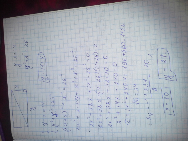 Найдите стороны прямоугольника если их равность равна 14 см, а диагональ прямоугольника- 26 см