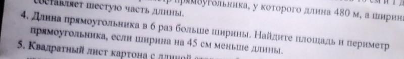 Добрый день подскажите как решить задачу: длина прямоугольника в 6 раз больше ширины. найдите площадь и периметр прямоугольника, если ширина на 45 см меньше длины.