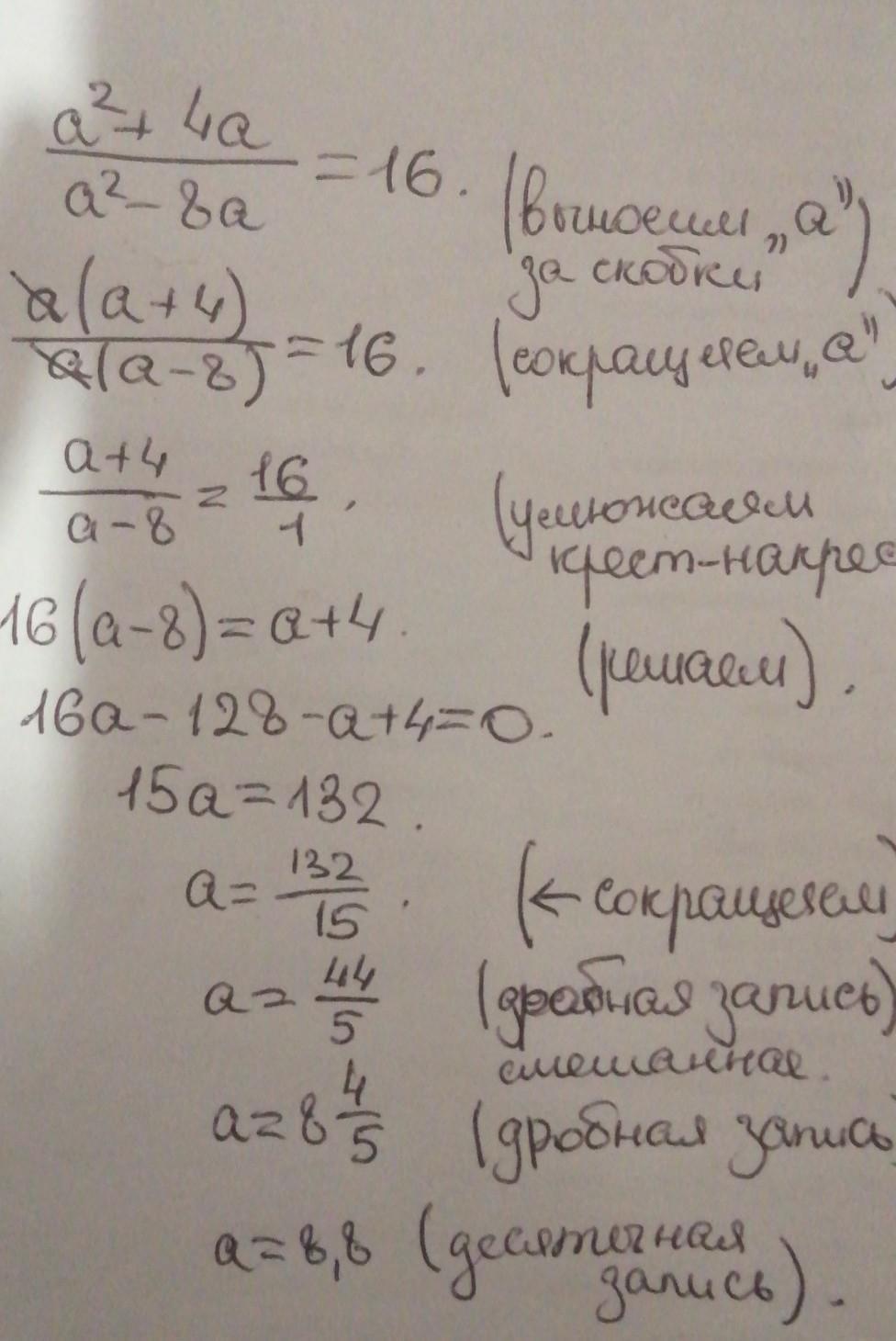 Дамы и Господа я Вас умоляяяяяяю помогиите!Если что в интернете искать не надо так сказать)Там ответов нет так как к сожалению этот пример составлен учителем)))Упростите выражение=a^2+4a\a^2=8a=16!Заранее спасибо и вот ещё-МОЛЮЮЮ ПОЖЖЖАЛУЙСТА ОТПРАВЬТЕ С РЕШЕНИЕМ ЭТОТ ОТВЕТ!Иначе к сожалению ответ у меня не засчитается,ну не суть!Удачи и ЗАРАААНЕЕ СПАААСИБО!