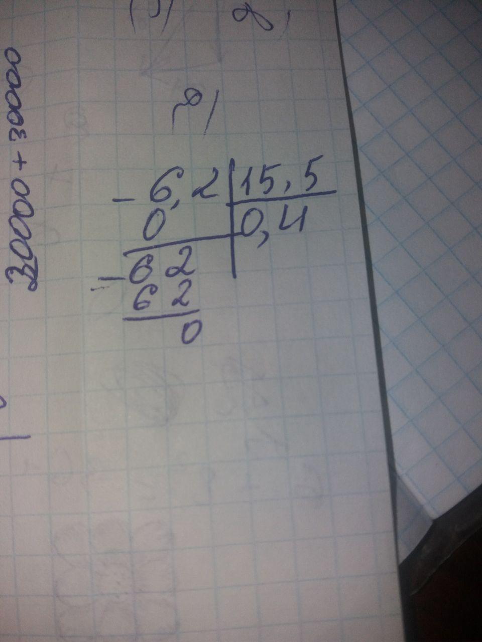 Мы переносим запятую на один знак. Т.к. мы не сможем так просто 62 разделить на 155, мы добавляем 0 к 62 (Получается 620), а к будущему ответу добавляем "0,". Делим 620 на 155, получаем 4