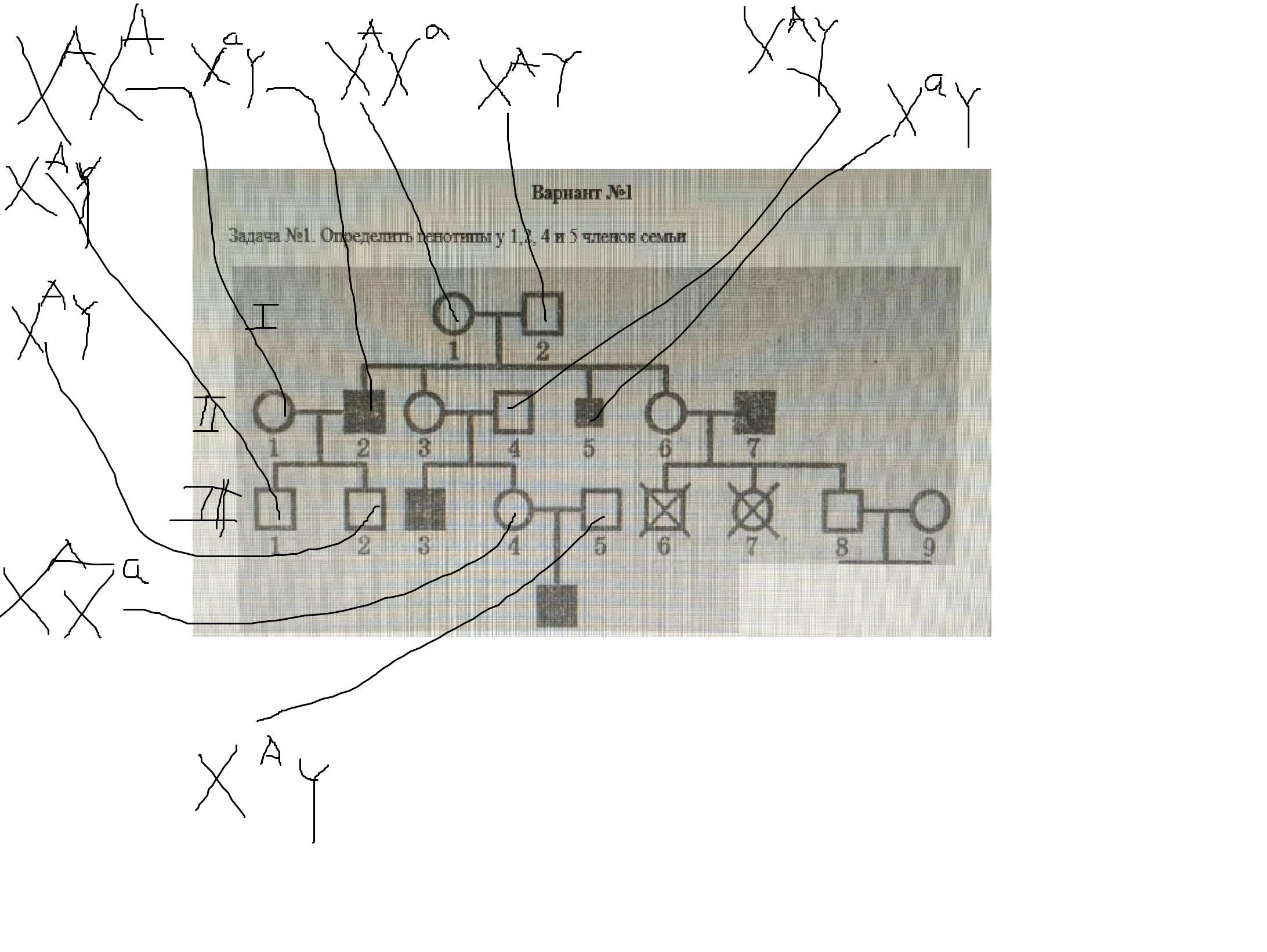 Абсолютно точно нам известно, что ген рецессивный ( т.к. доминантный бы проявился у любого из родителей ). Аутосомный или сцеплен с полом? Рассмотрим сразу и половой, и аутосомный случаи. Оба родителя в аутосомном случае гетерозиготны, т.к. иначе бы ген просто не проявился в поколении. Ген скорее всего сцеплен с Х хромосомой, так как наблюдается «проскок» через поколение. У женщины 1 II ряда с больным мужем рождаются только здоровые, у фенотипически нормальной женщины 3 II ряда рождается больной сын, дочь не болеет, все это наводит на то, что ген сцеплен с Х хромосомой. Генотипы на фото 1.