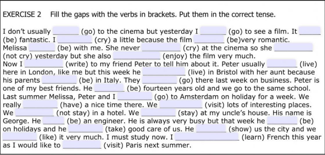 I dont usually go to the cinema but yesterday I went to see a film. It was fantasric. I cried a little because the film was very romantic. Melissa was with me. She never cried at the cinema so she didnt cried yesterday but she also enjoyed the film very much. Now I write to my friend Peter to tell him about it. Peter usually live in London, like me but this week he lived in Bistol with her aunt because his parents was 8n Italy. They went there last week on business. Peter is one of my best friends. He was forteen years old and we go to the same school. Last summer Peter, Melissa and I went to amsterdamm holifay for a week. We really had nice time there. We visited lot of interesting places. We didnt stay in a hotel. We stayed at my uncle's house. His name is George. He was an engineer. He is always very busy but this week he was on holidays and he took good care about us. He showed us the city and we liked it very much. I must study now. I learning French this year as I would like to visit Paris.