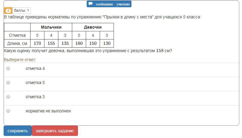 В таблице приведены нормативы по упражнению "Прыжки в длину с места" для учащихся 5 класса: