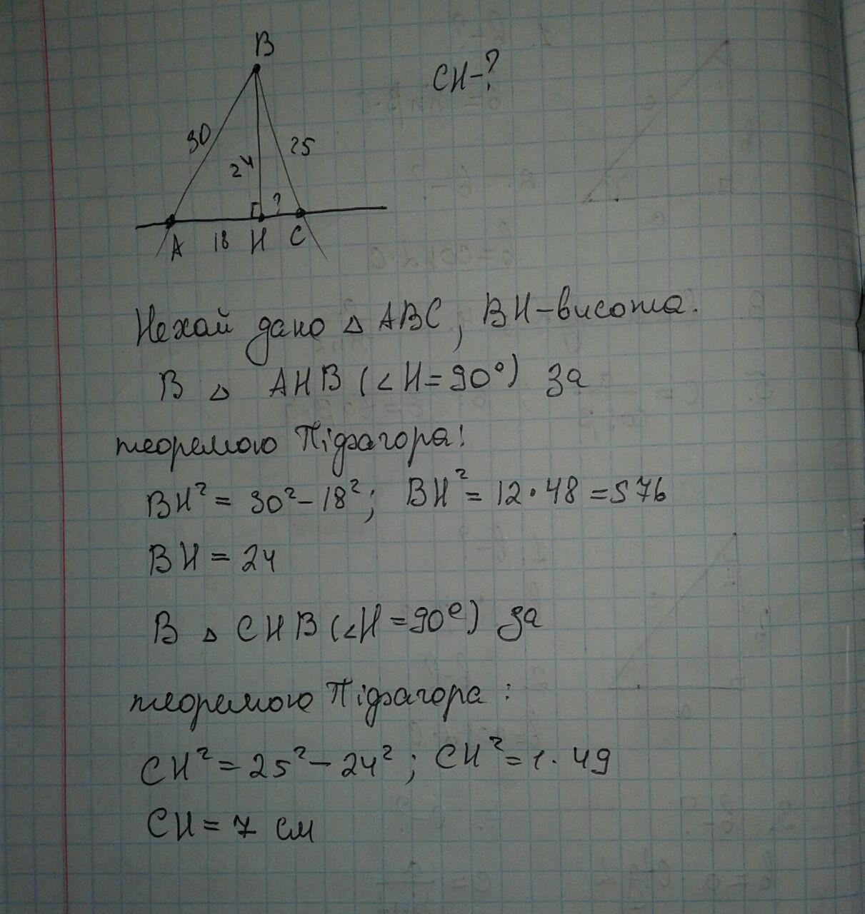 З точки до прямої проведено дві похилі.Довжина однієї з них 30 см, а довжина її проекції на площину дорівнює 18 см. Знайти довжину другої похилої, якщо її проекція дорівнює 15 см.