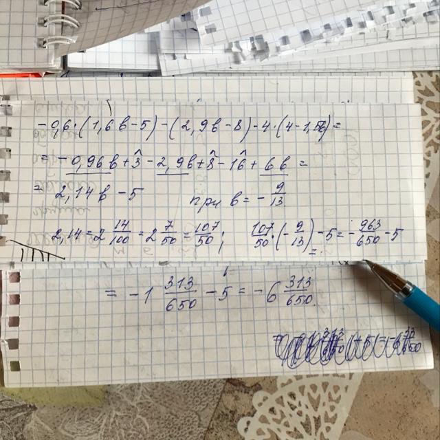 -0,6(1,6b-5)-(2,9b-8)-4(4-1,5b) и вычислить его значение при b=-9/13(черта-это дробь!)