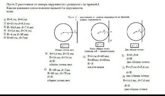 Пусть D расстояние от центра окружности с радиусом r до прямой l. Какова взаимное расположение прямой l и окружности, есле: R=8 см, d=6 см; R=10 см d=8,4 см; R=14,4 дм, d=7,4 дм; R=1,6 дм, d=24 см; R=4 см d=40 мм; R=60 см, d=7дм?