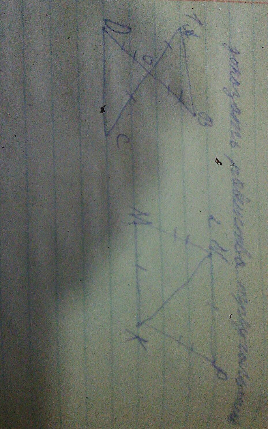 2)NPK=KMN, т.к. NP=MK, MN=PK и сторона NK общая (3 признак равенства треугольников).