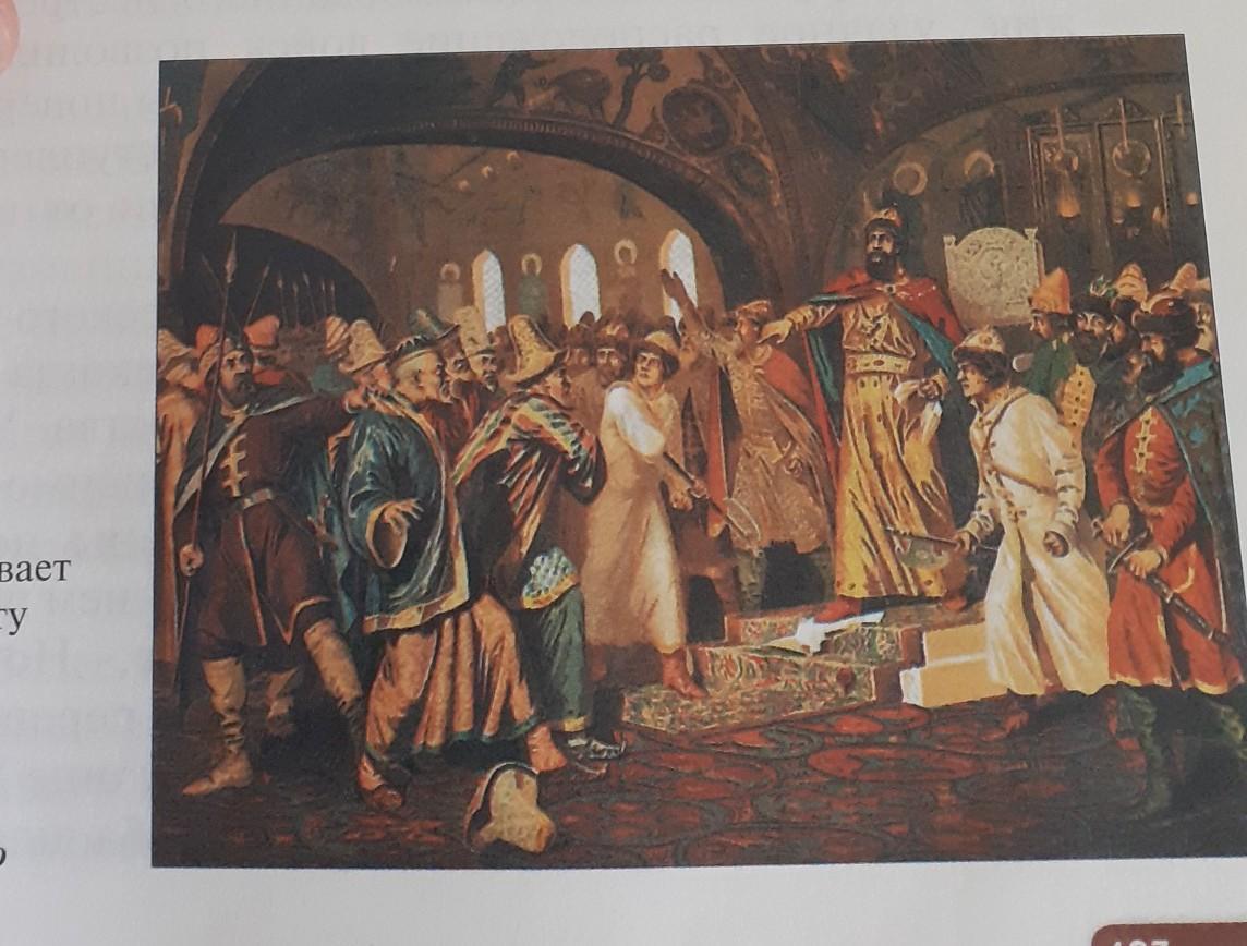 Опишите картину Иван 3 разрывает ханскую грамоту и басму перед татарскими послами .