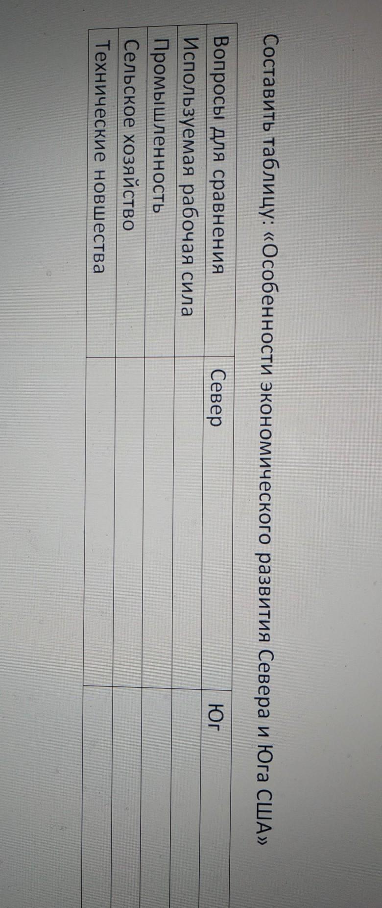 Промышленность ---> Север ; Промышленный переворот, развитие капитализма, крупное фабричное производство. Юг; Промышленность не развита. Это пол таблицы ;)