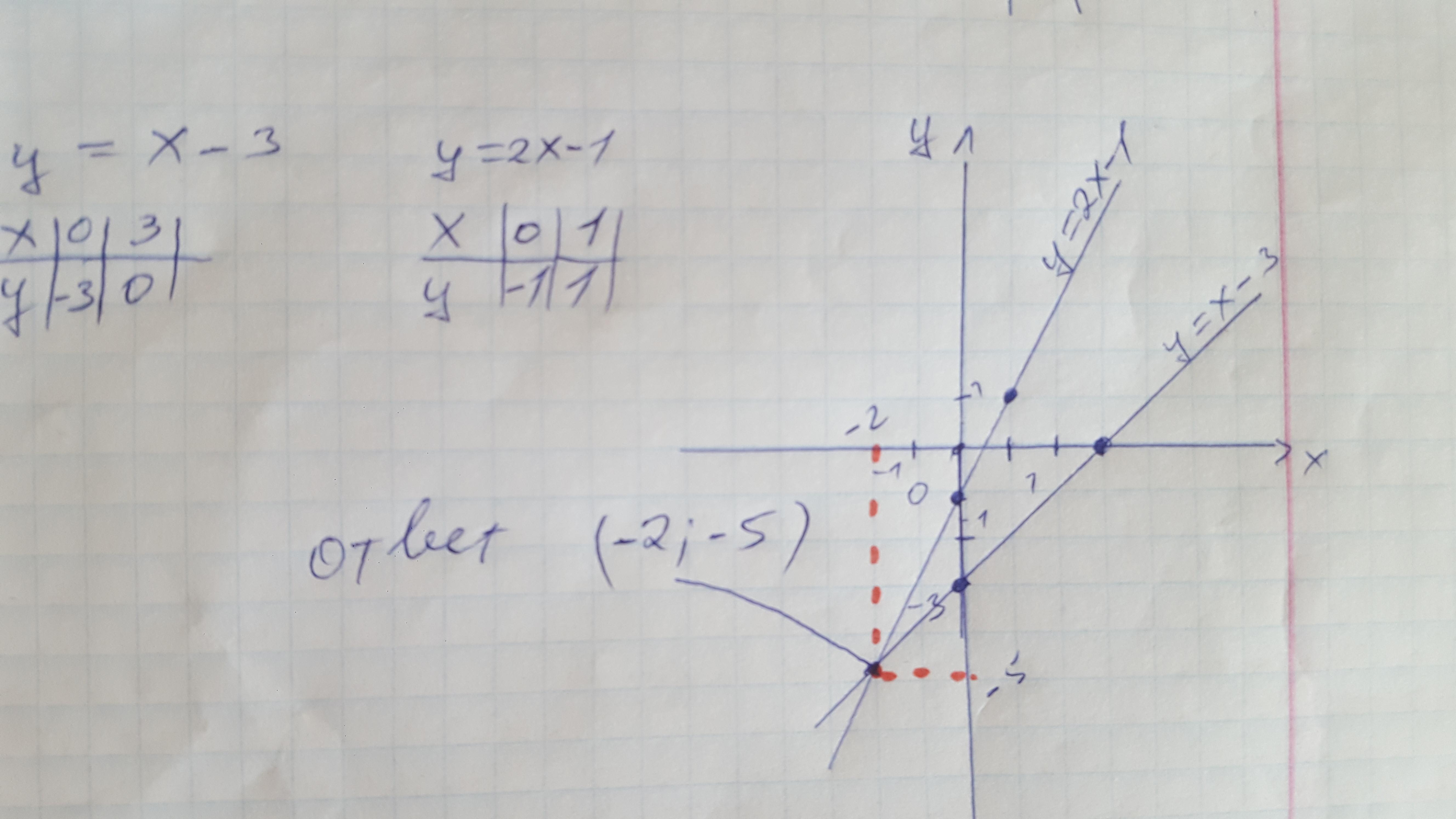 Постройте в одной системе координат графики функций и укажите координаты точки их пересечения y=x-3 и y=2x-1