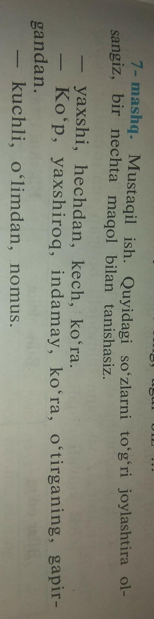 mustaqil ish quyidagi sozlarni togri joylashtira olsangiz bir nechta maqol bilan tanishasiz
