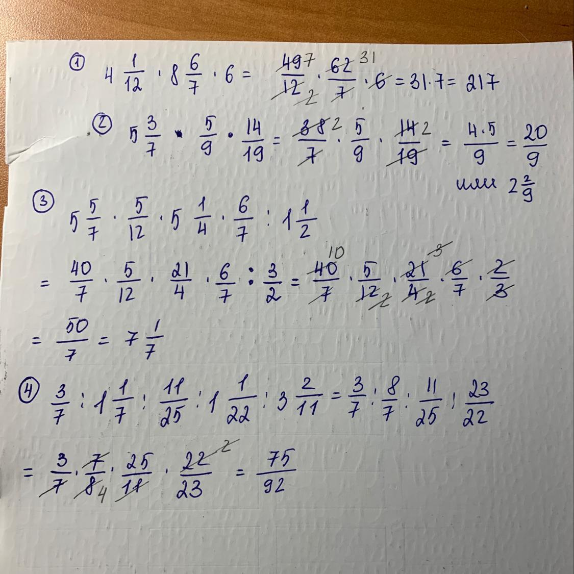 Подробное решение на фото. Сначала все приводим в неправильные дроби. Потом где можно сокращаем. Там где деление дробь переворачивается.