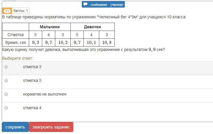 В таблице приведены нормативы по упражнению "Челночный бег 4*9м" для учащихся 10 класса: