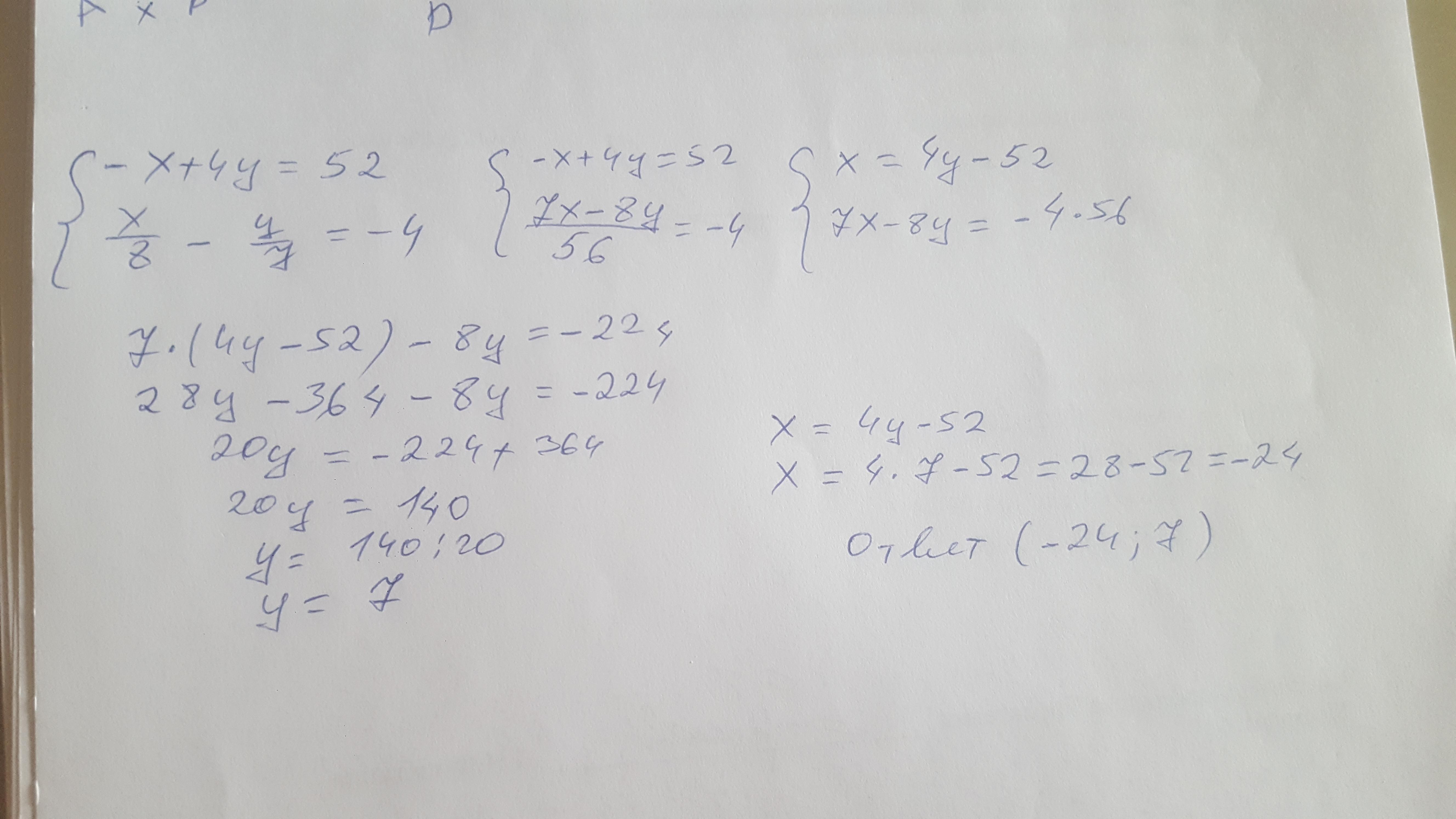 Найдите решение системы уравнений или докажите, что системы не имеют решений -x+4y=52. x/8-y/7=-4
