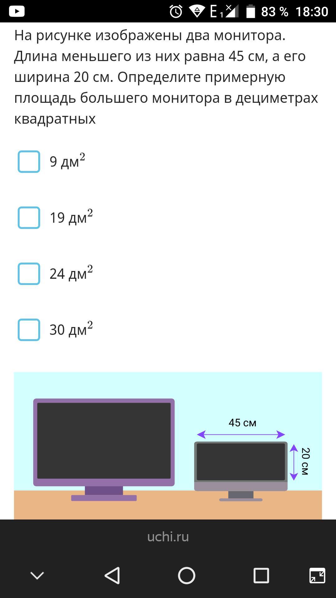 Из рисунка видно, что по ширине оба мониторы примено одинаковы, а длина большего составляет около 50 см, значит, площадь большего монитора составит от 8 до 12 дм2.