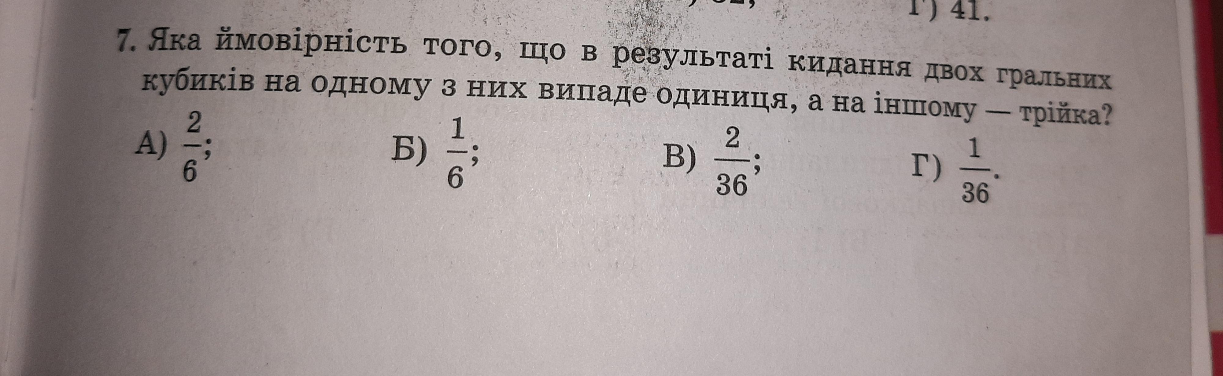 Пошаговое объяснение:в одном игральном кубике 6 сторон в другом тоже, 6 на 6 = 36 значит шанс один на 36
