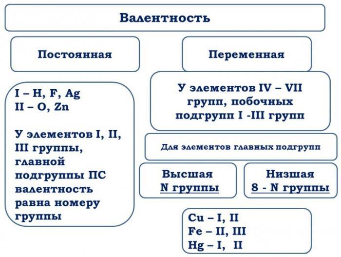 За единицу валентности принята валентность атома водорода, равная 1, то есть водород одновалентен. Поэтому валентность элемента указывает на то, со сколькими атомами водорода соединён один атом рассматриваемого элемента. Например, HCl, где хлор – одновалентен; H2O, где кислород – двухвалентен; NH3, где азот – трёхвалентен.