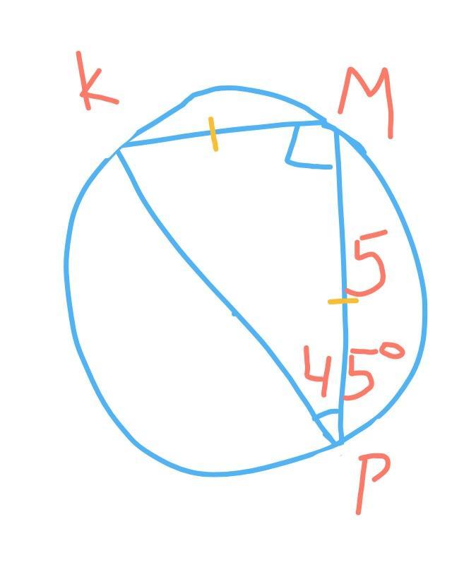 В окружности проведен диаметр КР, точка М принадлежит окружности, угол МРК равен 45 градусов, МР = 5 см. Найти длину хорды КМ. С рисунком желательно.