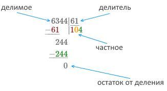 Рассмотрим как делить в столбик на примере нахождения частного двух чисел 6344 ÷ 61.