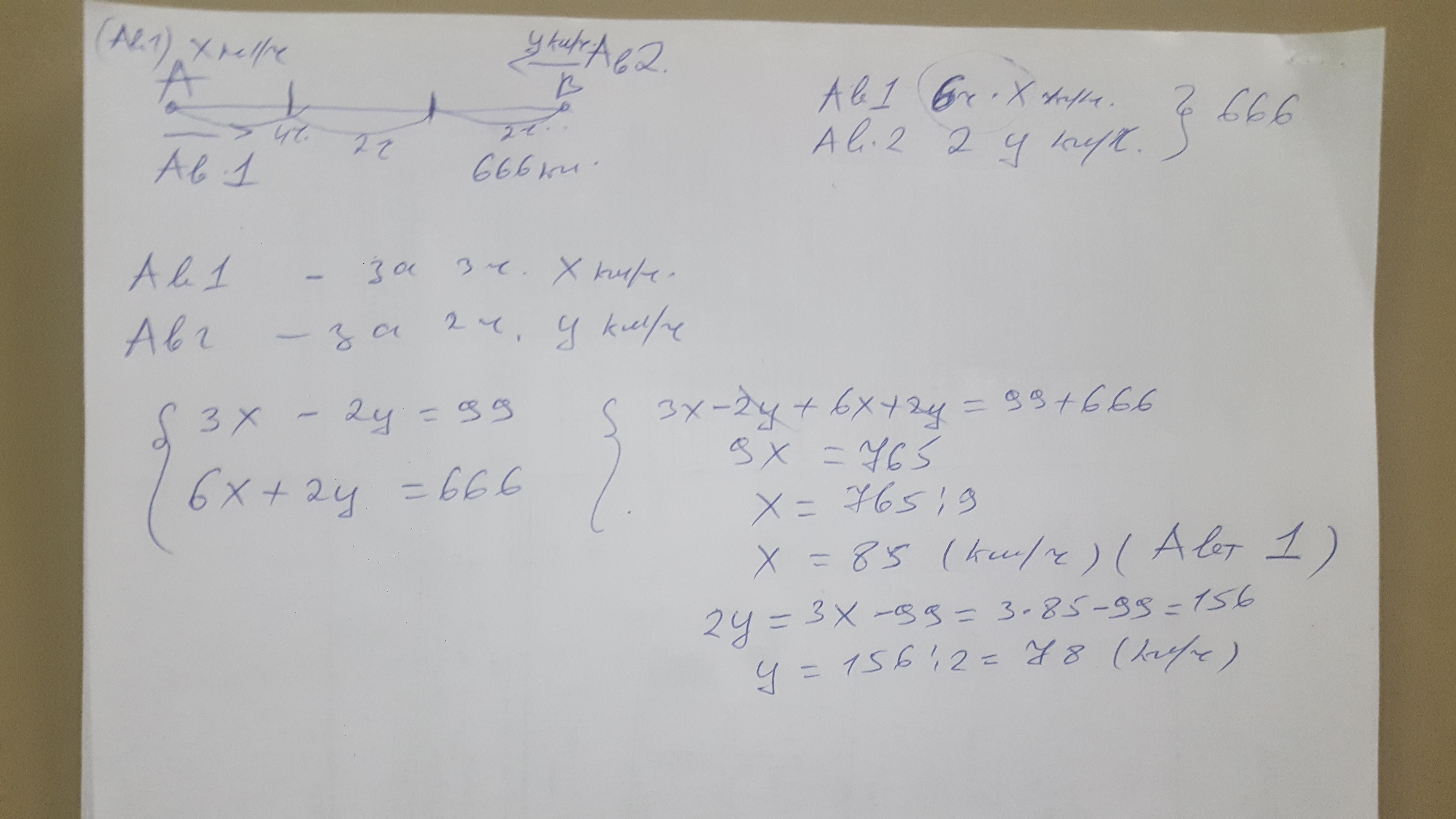 Из пунка А в пункт Б, расстояние между которыми 666км, выехал автомобиль. Через 4 часа после начала движения первого автомобиля навстречу ему из пункта Б выехал второй автомобиль, который встретился с ним через 2 часа после своего выезда. Найдите скорость автомобиля, если первый за три часа проезжает на 99 км больше, чем второй за два часа.