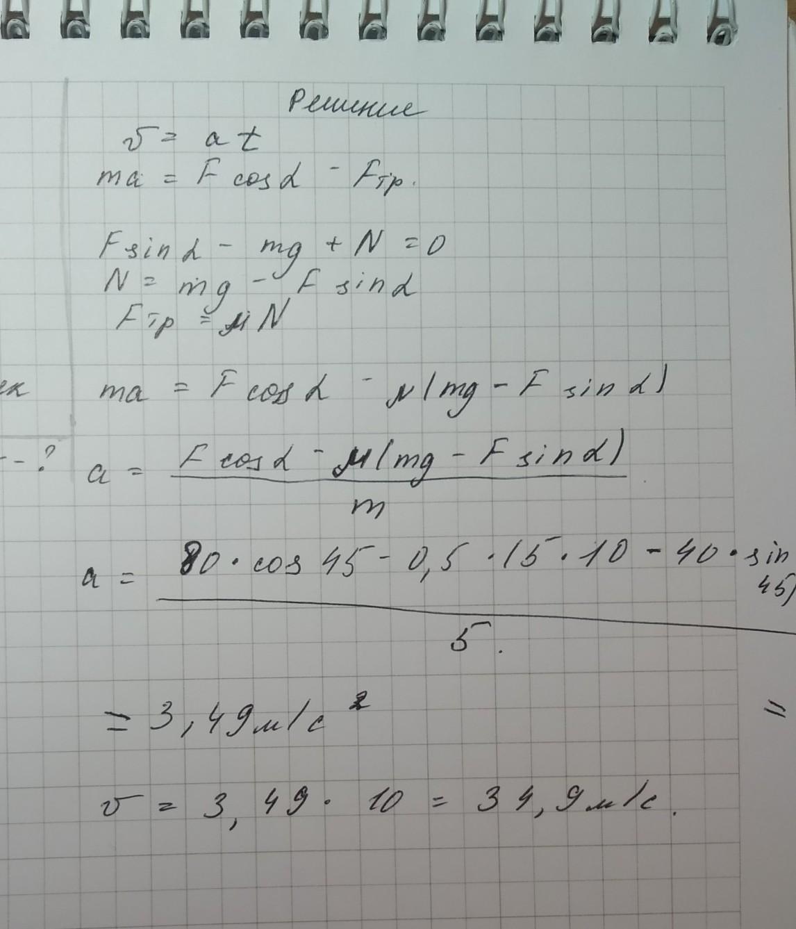 m=5 кг, v0=0, F= 80 Н, α= 45°, t=10 c, μ=0,5. v-?Решение. Скорость v=v0+at= at. Найдем a. Ось ОХ направим по направлению силы F. Тогда проекция cилы F положительна и равна F*cosα, а проекция силы трения на ось ОХ отрицательна и равна -μmg. Равнодействующая сил, действующих по горинтальной оси F*cosα- μmg =ma. Отсюда a= *F*cosα- μmg)/m = (80*0,71-0,5*5*10)/5= 15,9 м/с^2.