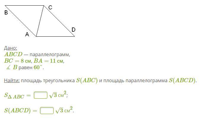 S(треугольника АВС) =1/2*8*11*sin60=22√3