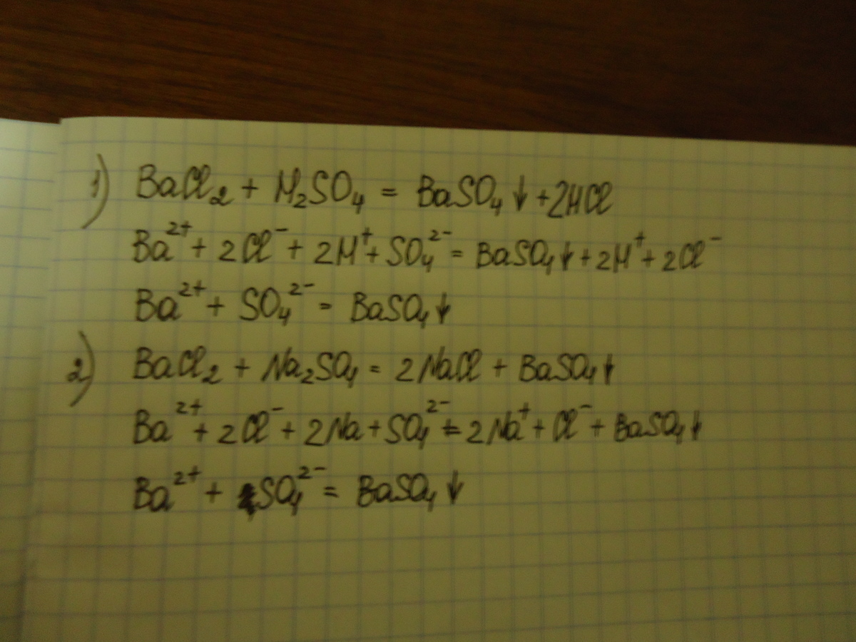 Рівняння хімічної реакції в молекулярній,повній та скороченій йонній формах:сульфатної кислоти з барій хлоридом та натрій сульфату з барій хлоридом.Якщо можна то фоткой