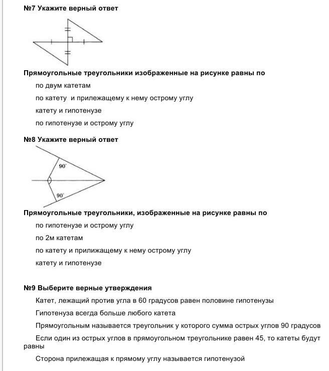 9. 2,4 гипотенуза больше катетов, если одни из острых углов равен 45, то катеты равны
