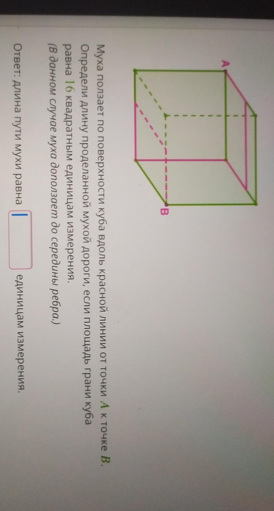 муха ползает по поверхности куба вдоль красной линии от точки А к точке б Определи длину проделанной мухой дороги если площадь грани куба равна 16 квадратным единицам измерения в данном случае могут пропадать до середины ребра