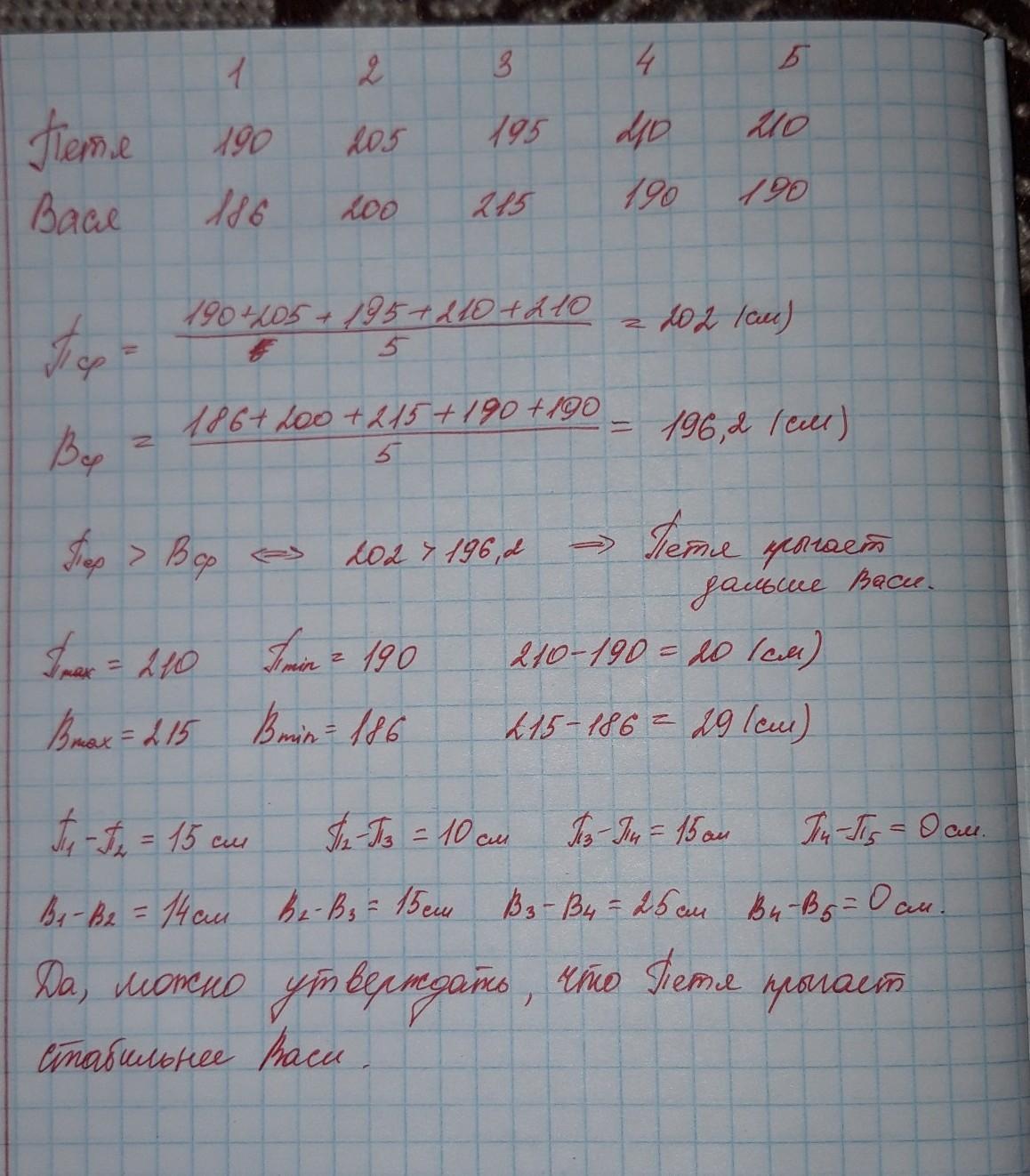 Петя и Вася поспорили, кто лучше прыгает в длину с места. Чтобы избежать случайности, они решили, что будут прыгать по очереди пять раз. Результаты своих прыжков в сантиметрах они записали в таблицу: